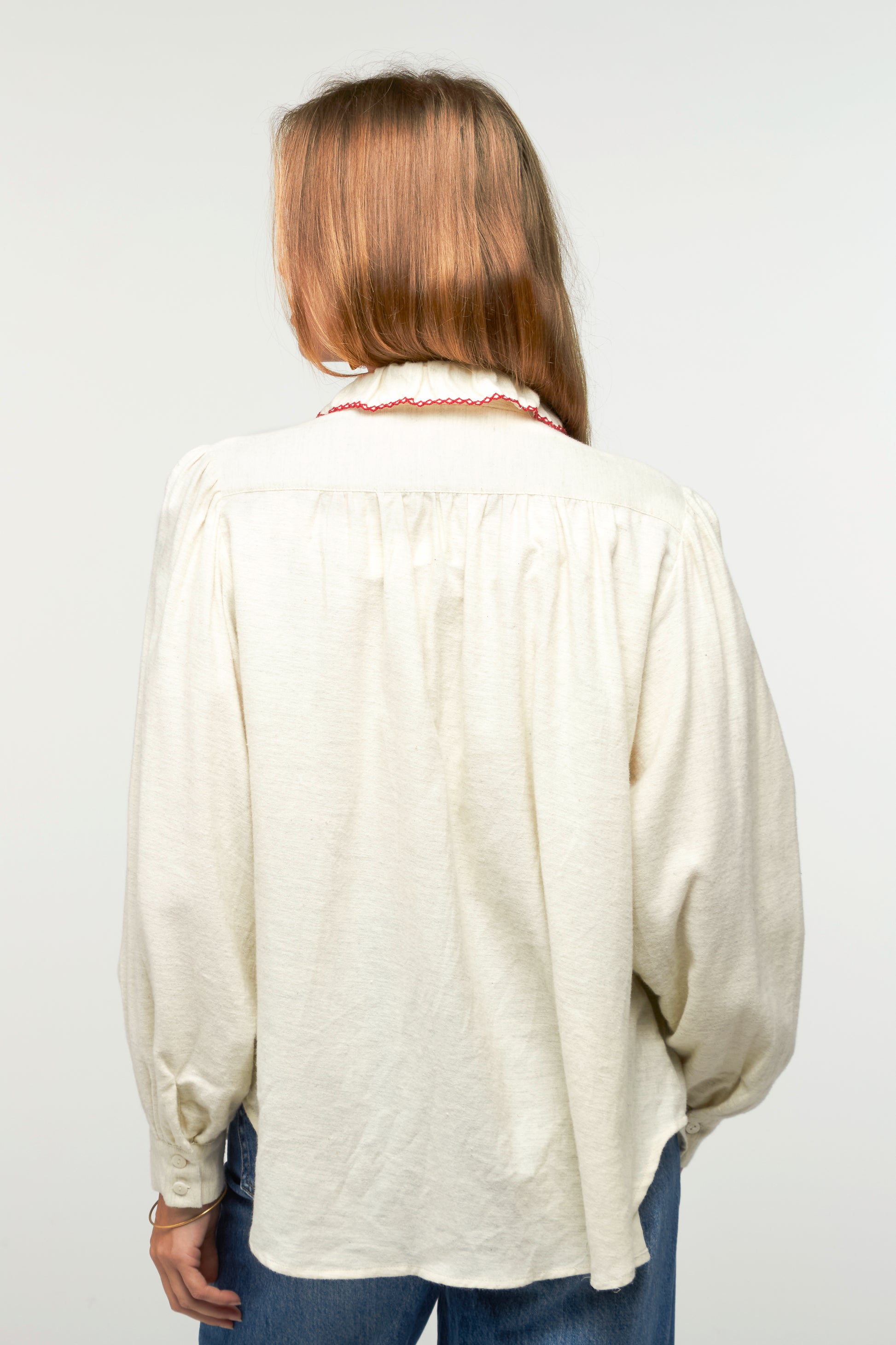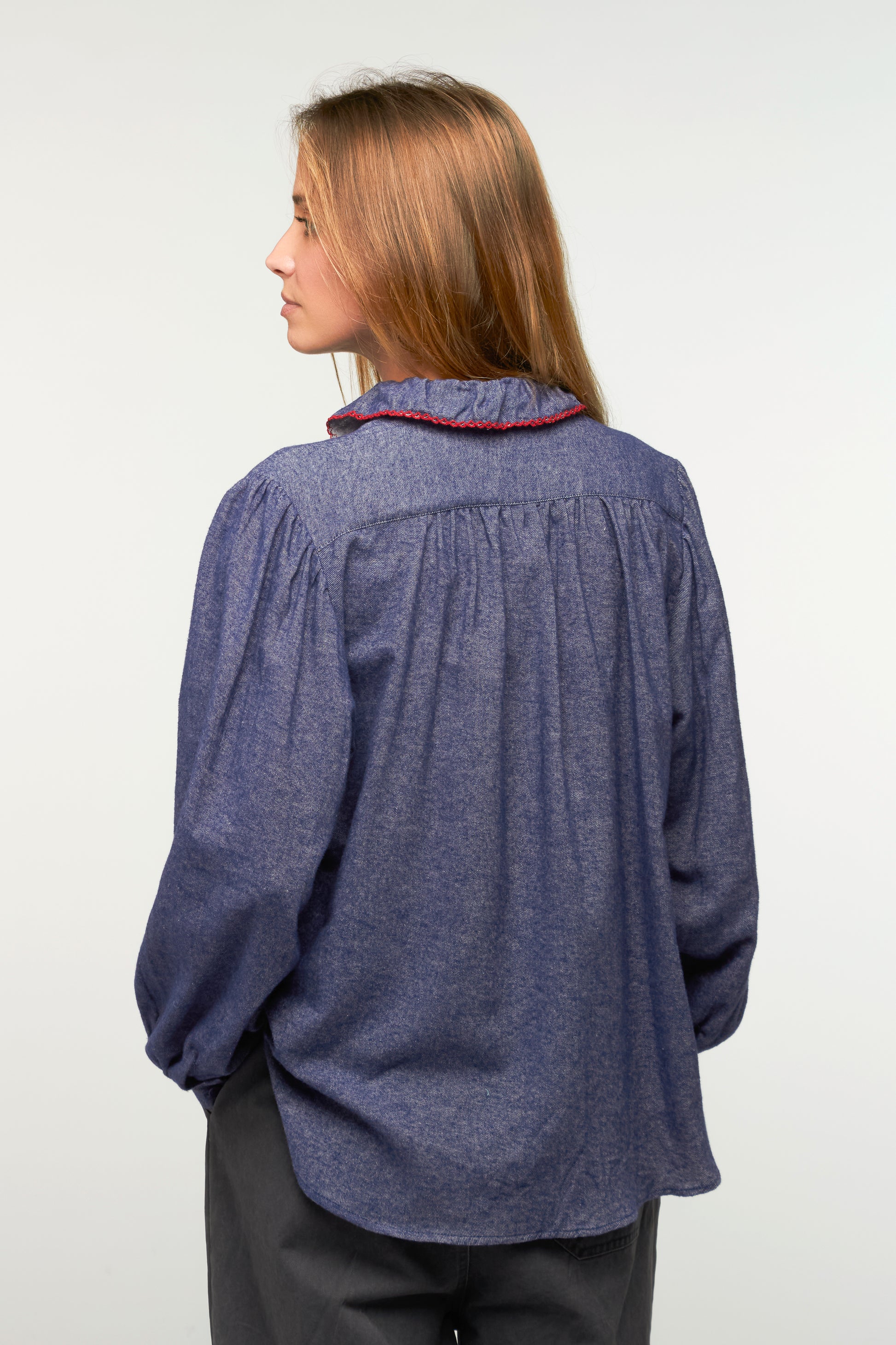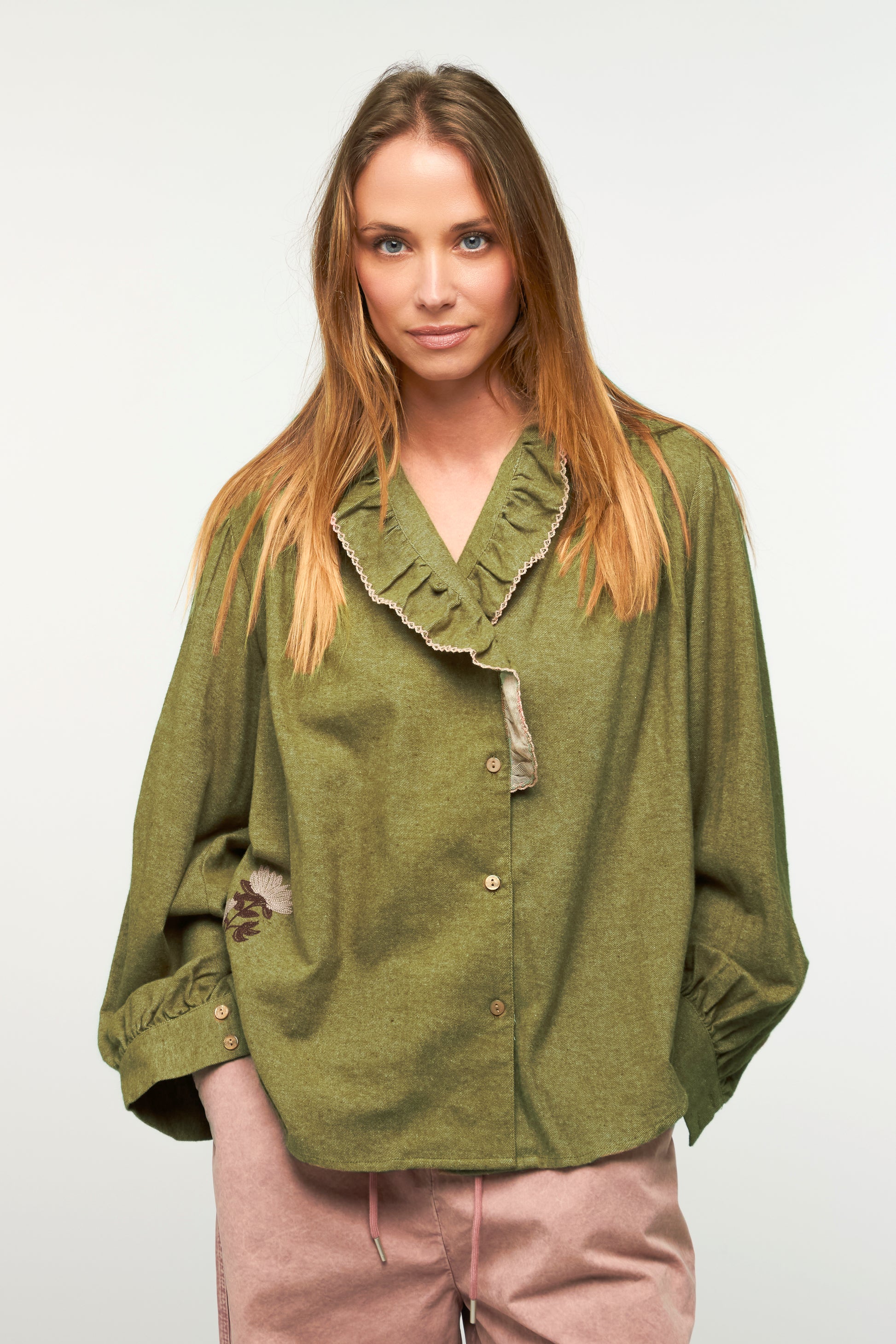 Cette chemise se décline en plusieurs variantes, des versions colorées aux teintes plus neutres, pour s’adapter à toutes les envies. Son col à volants est souligné de broderies fantaisie délicates, apportant une touche de féminité. Une pièce facile à porter, qui joue sur les détails pour twister une silhouette simple avec subtilité.