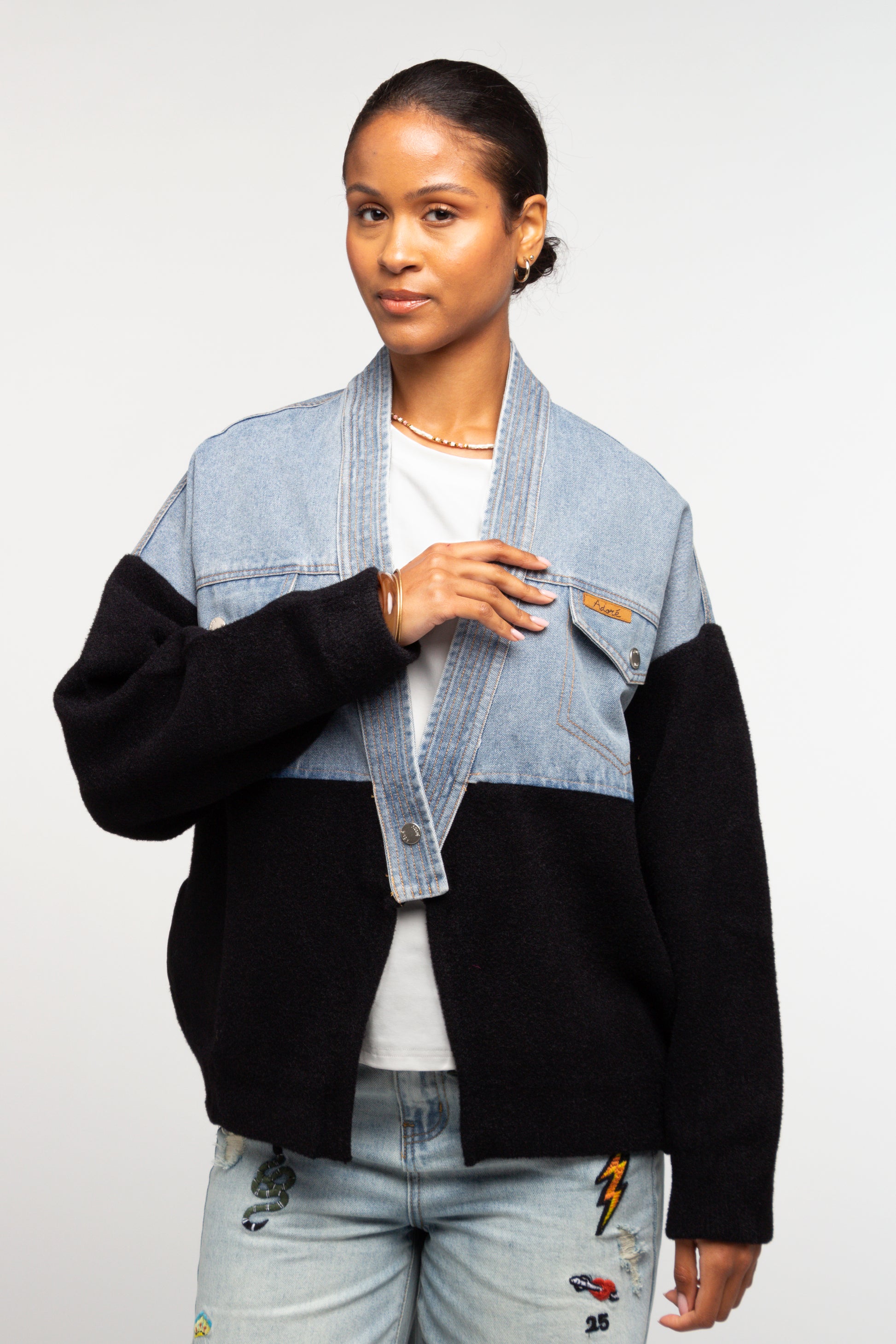 La veste SYDNEY affirme un style contemporain grâce à son jeu de matières contrastées. Le haut en denim structuré rencontre une maille douce et enveloppante sur le bas et les manches, créant une silhouette moderne à l’esprit workwear revisité. Une pièce forte, pensée pour celles qui aiment mixer les textures avec naturel.