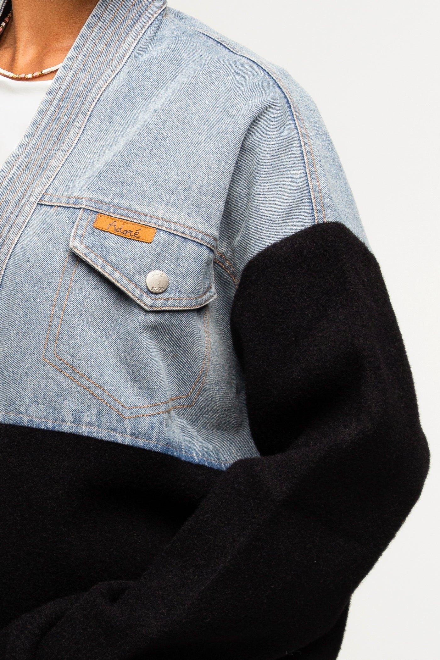 Détails : bi-matière, poche poitrine, finitions denim