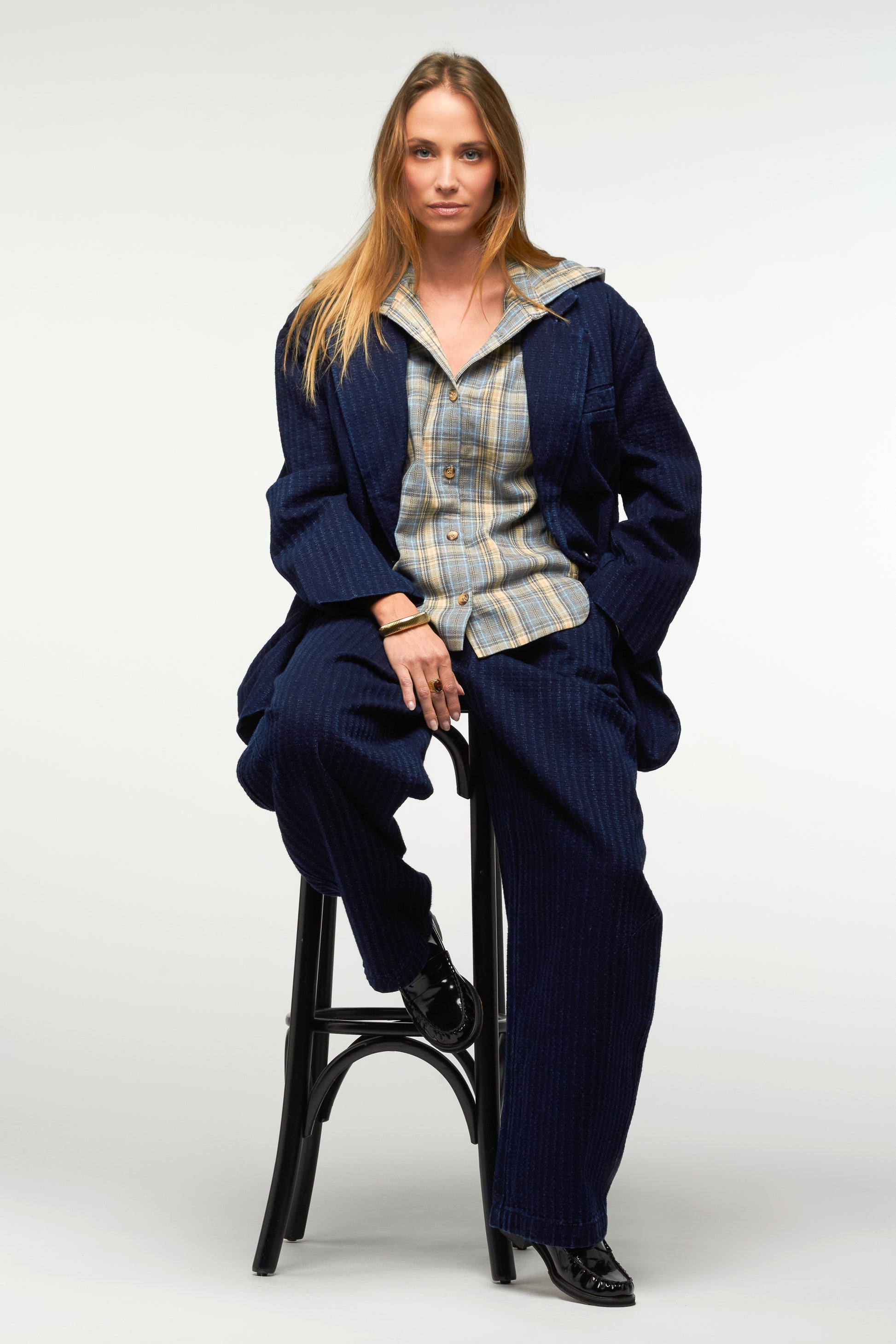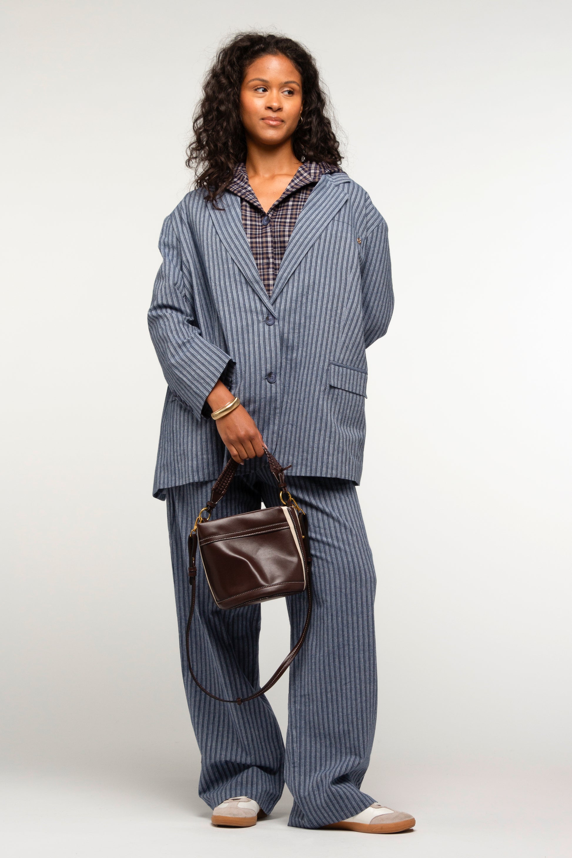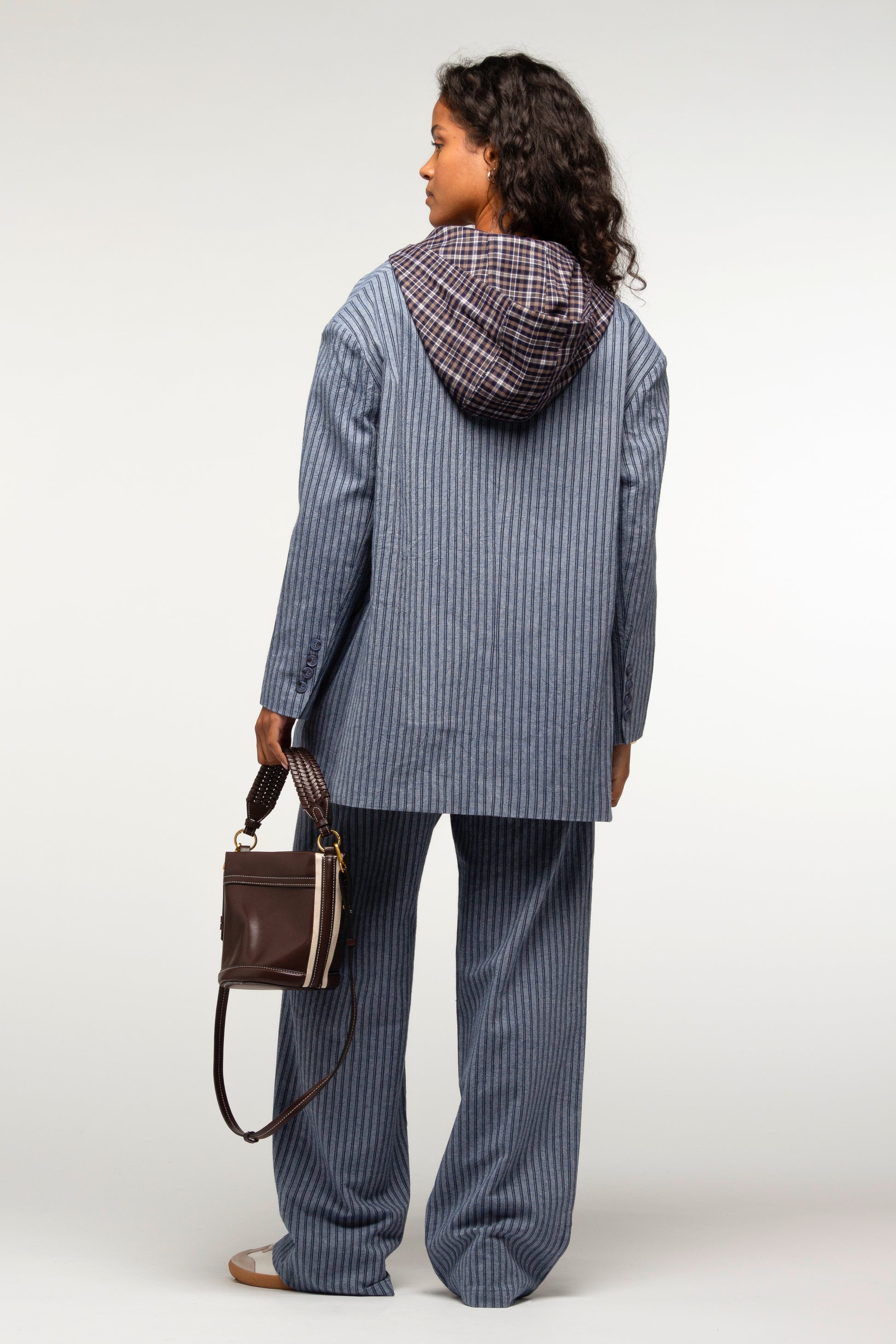 Cette veste à l’esprit tailoring revisité se distingue par son jeu de superposition. Sa coupe droite légèrement ample, inspirée du vestiaire masculin, structure la silhouette tout en conservant une allure décontractée. Le motif rayé apporte une touche graphique et élégante, renforçant son caractère affirmé. Elle est dotée d’un panneau chemise à capuche amovible, fixé par un zip, qui crée un effet de layering subtil et modulable selon l’envie. Portée avec ou sans ce détail, la veste se transforme et s’adapte facilement aux différents styles.