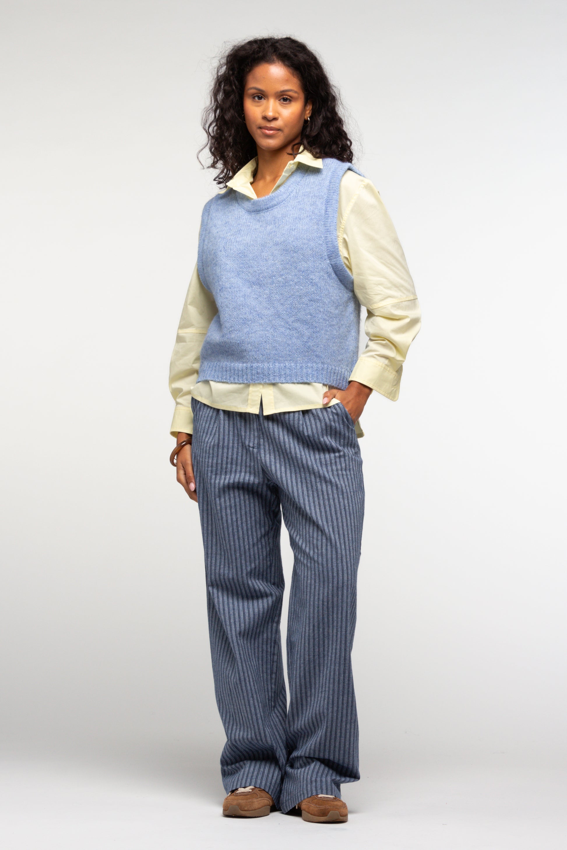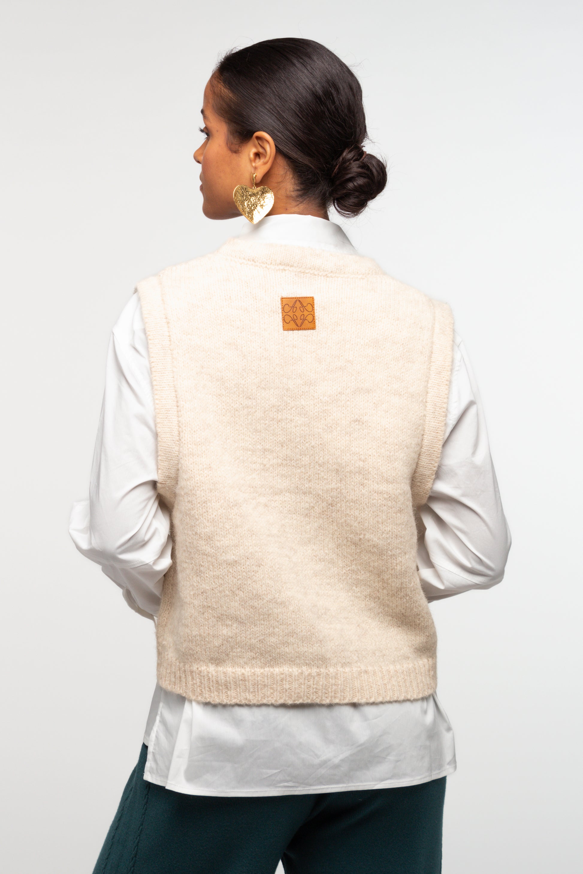 Ce pull sans manches à la coupe droite se superpose facilement sur une chemise, un tee-shirt ou une blouse fluide pour créer du volume sans alourdir la silhouette.