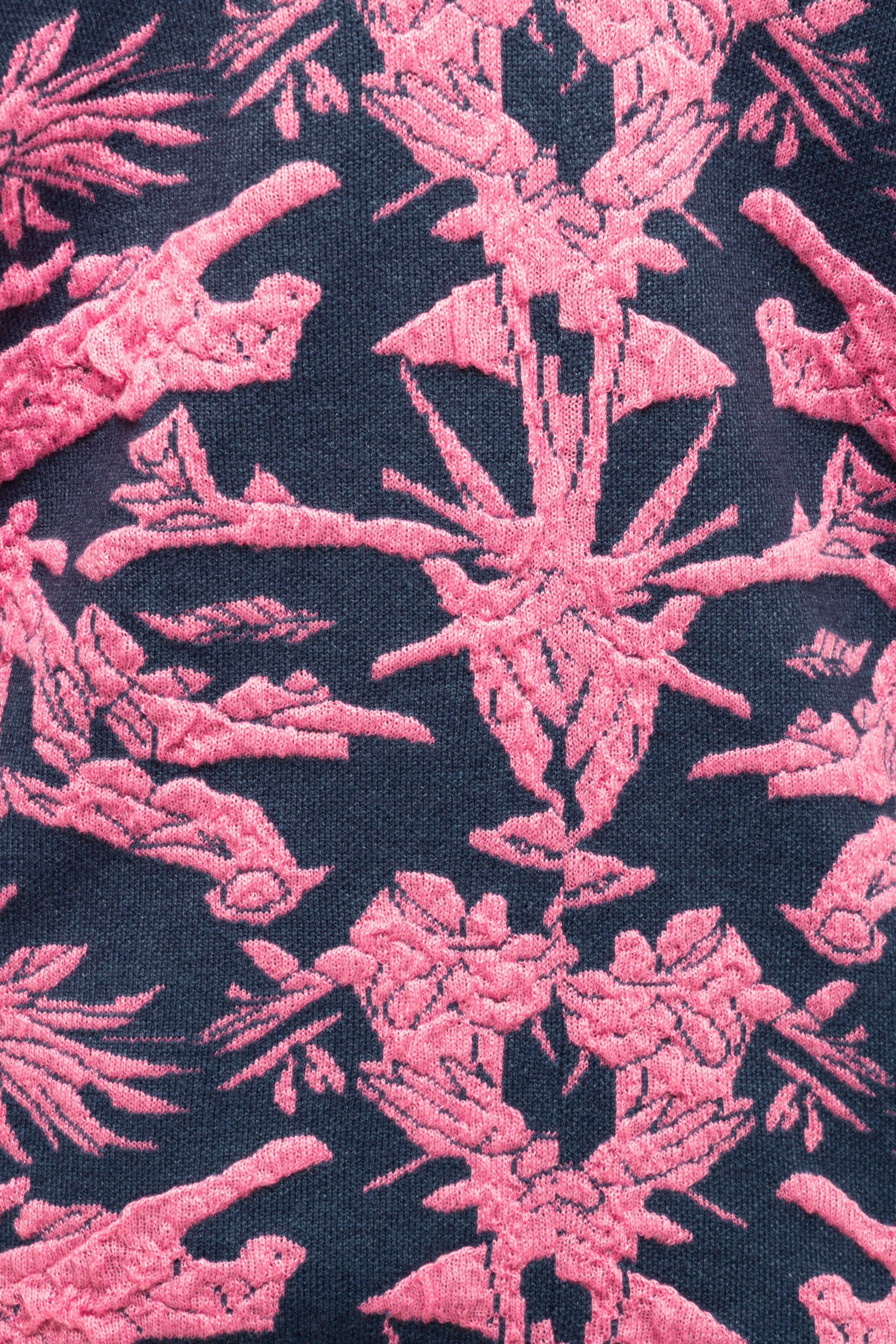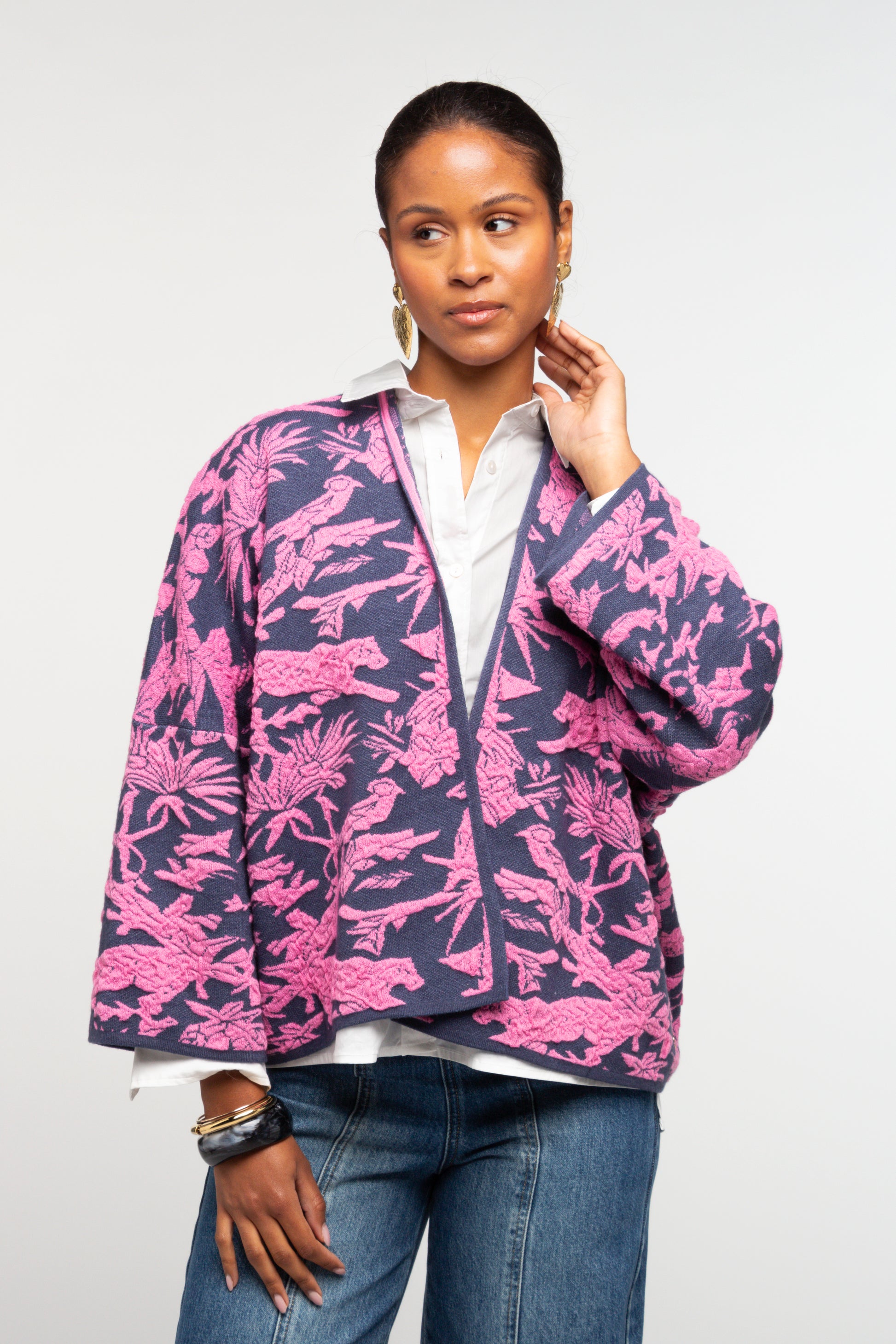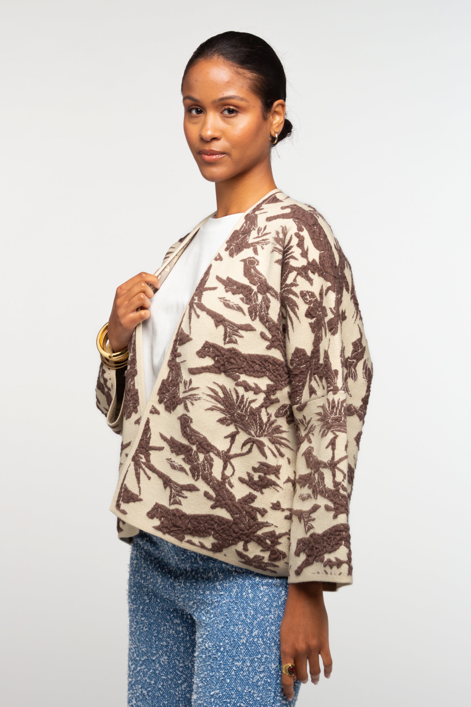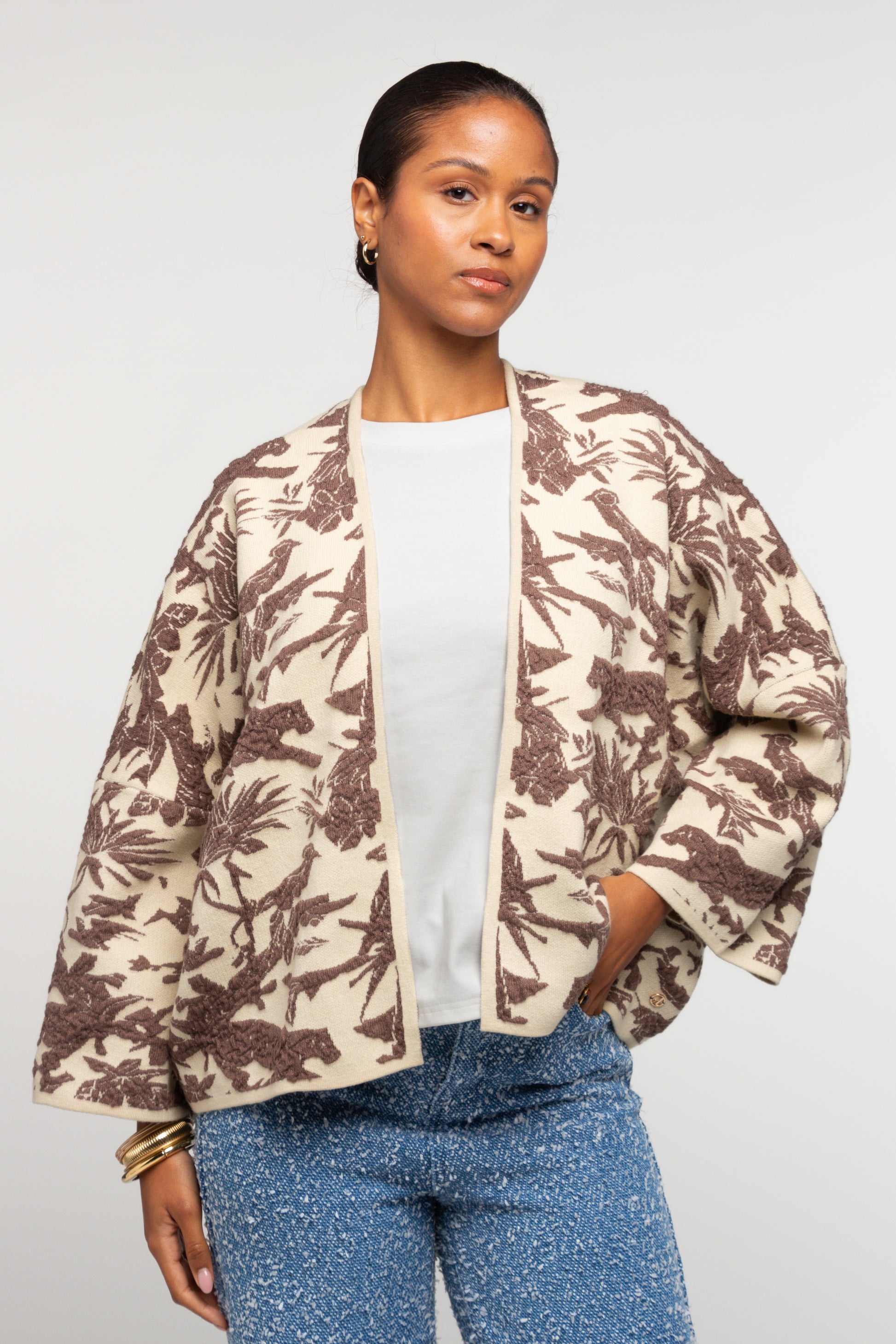 Ce gilet se distingue par son jacquard à motifs végétaux, qui apporte du relief et une vraie richesse visuelle à la pièce. Sa coupe droite et légèrement ample offre un porté confortable, facile à intégrer au vestiaire du quotidien.