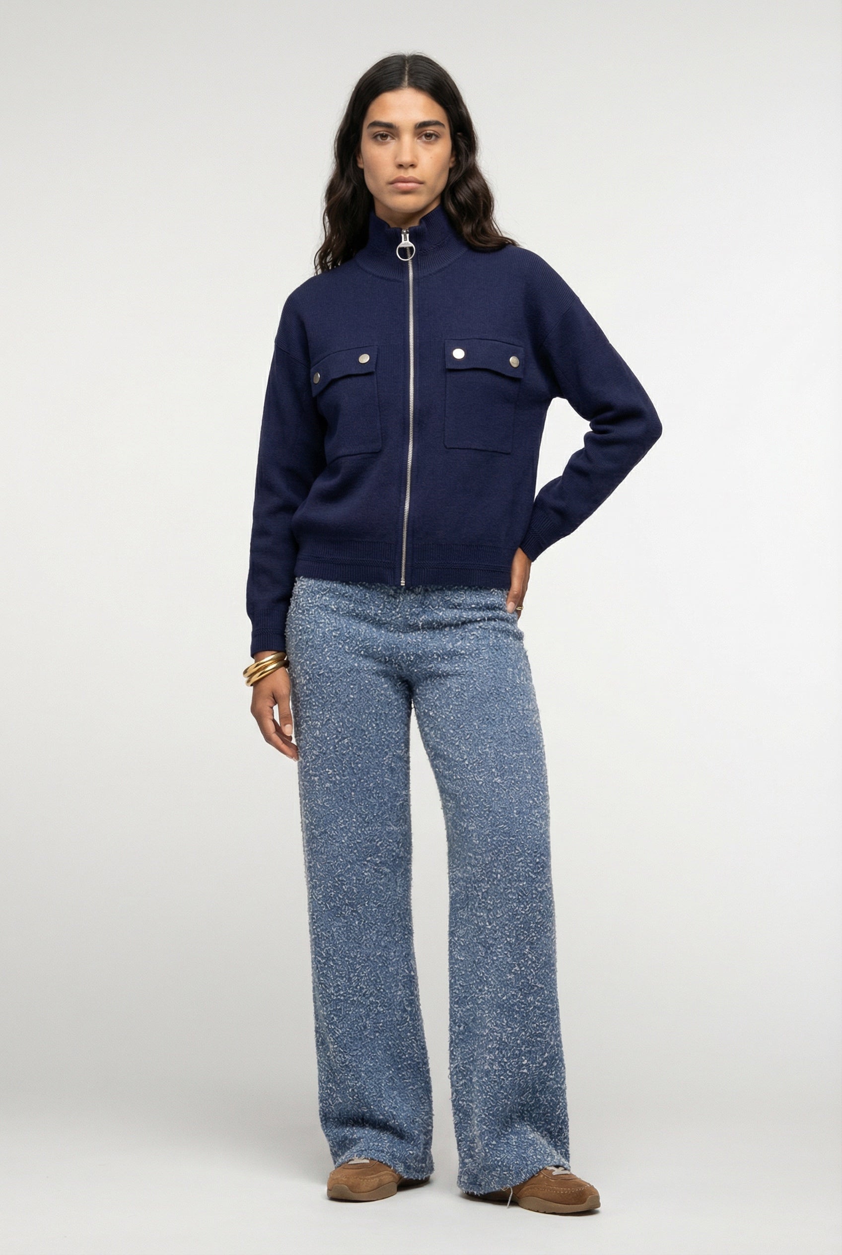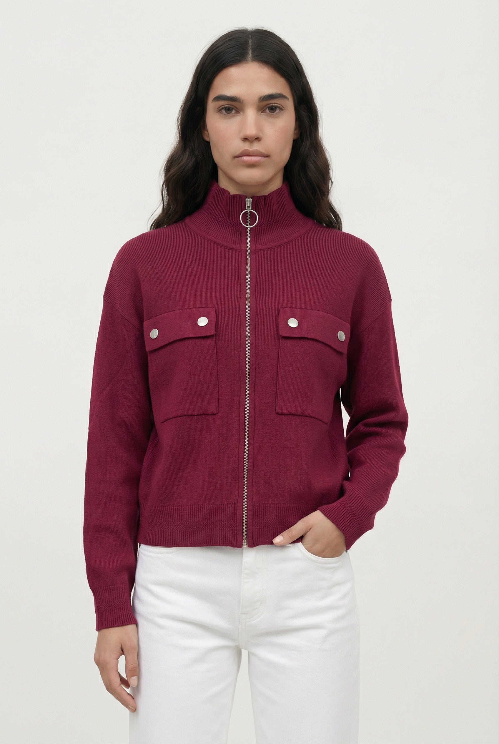 Le gilet Juliana séduit par son allure contemporaine et sa maille confortable. Sa coupe droite légèrement ample est structurée par une fermeture zippée et un col montant qui rendent cette pièce facile à porter. Les poches poitrine et le petit patch signature au dos viennent ponctuer la pièce de détails soignés.