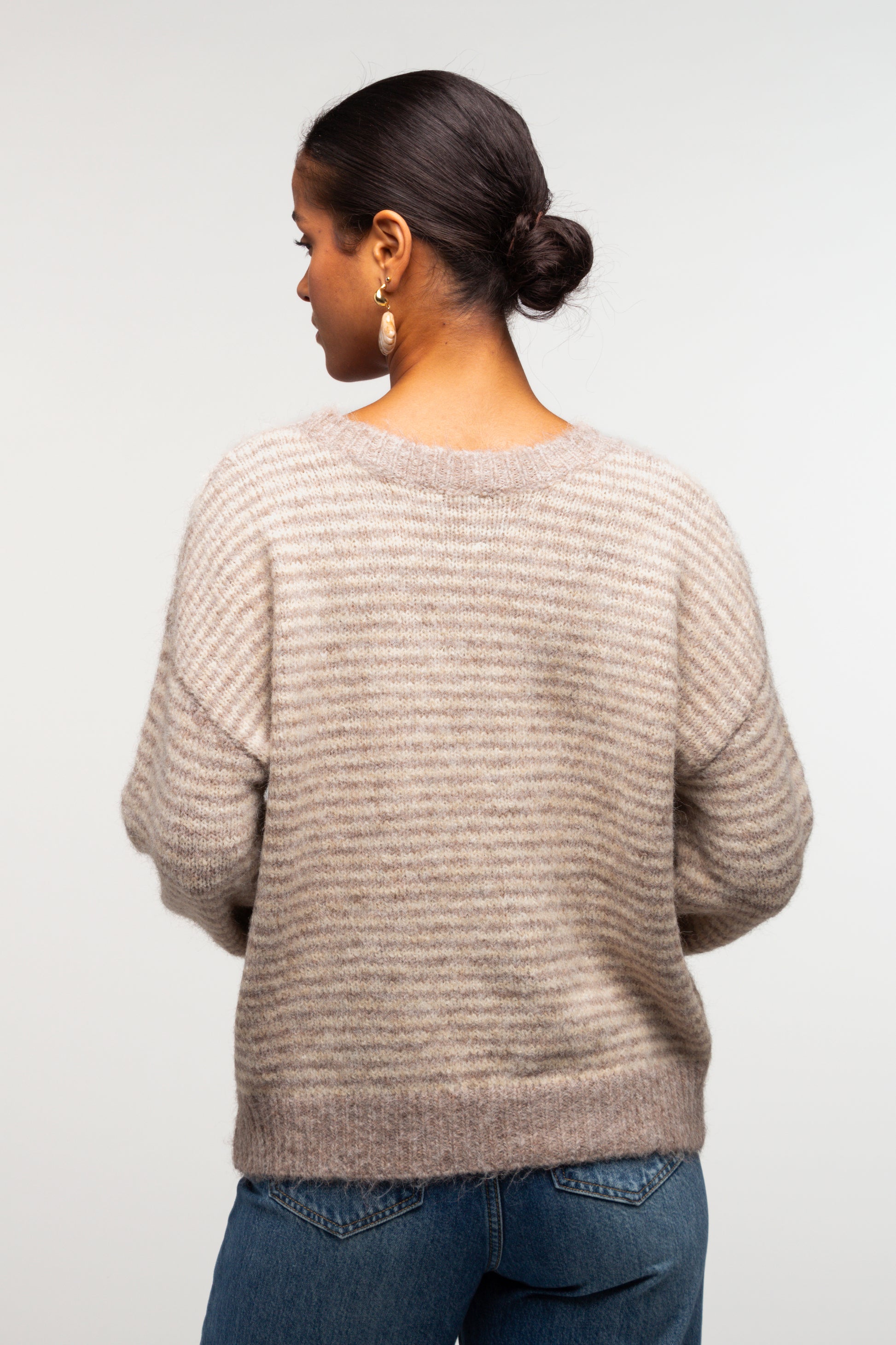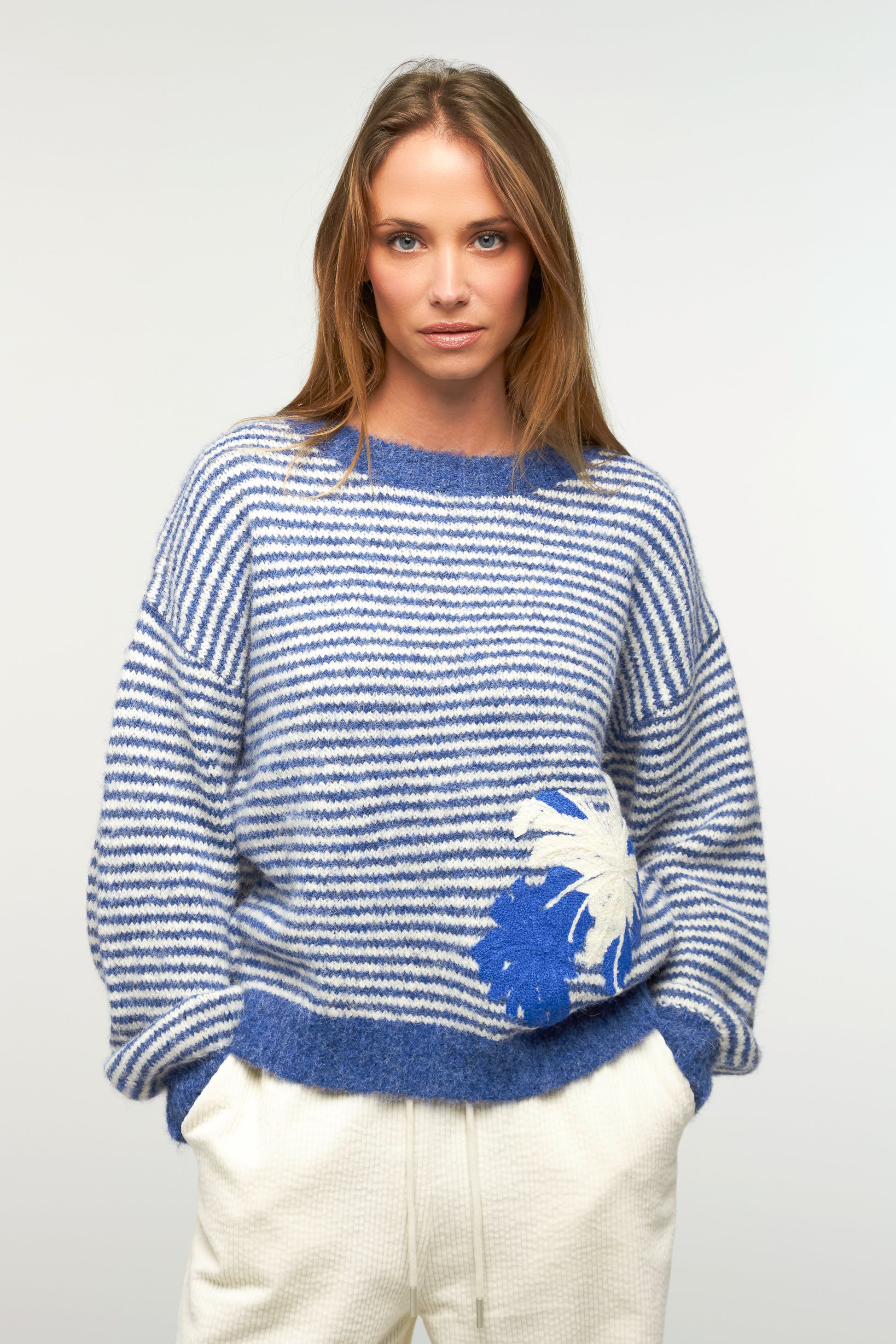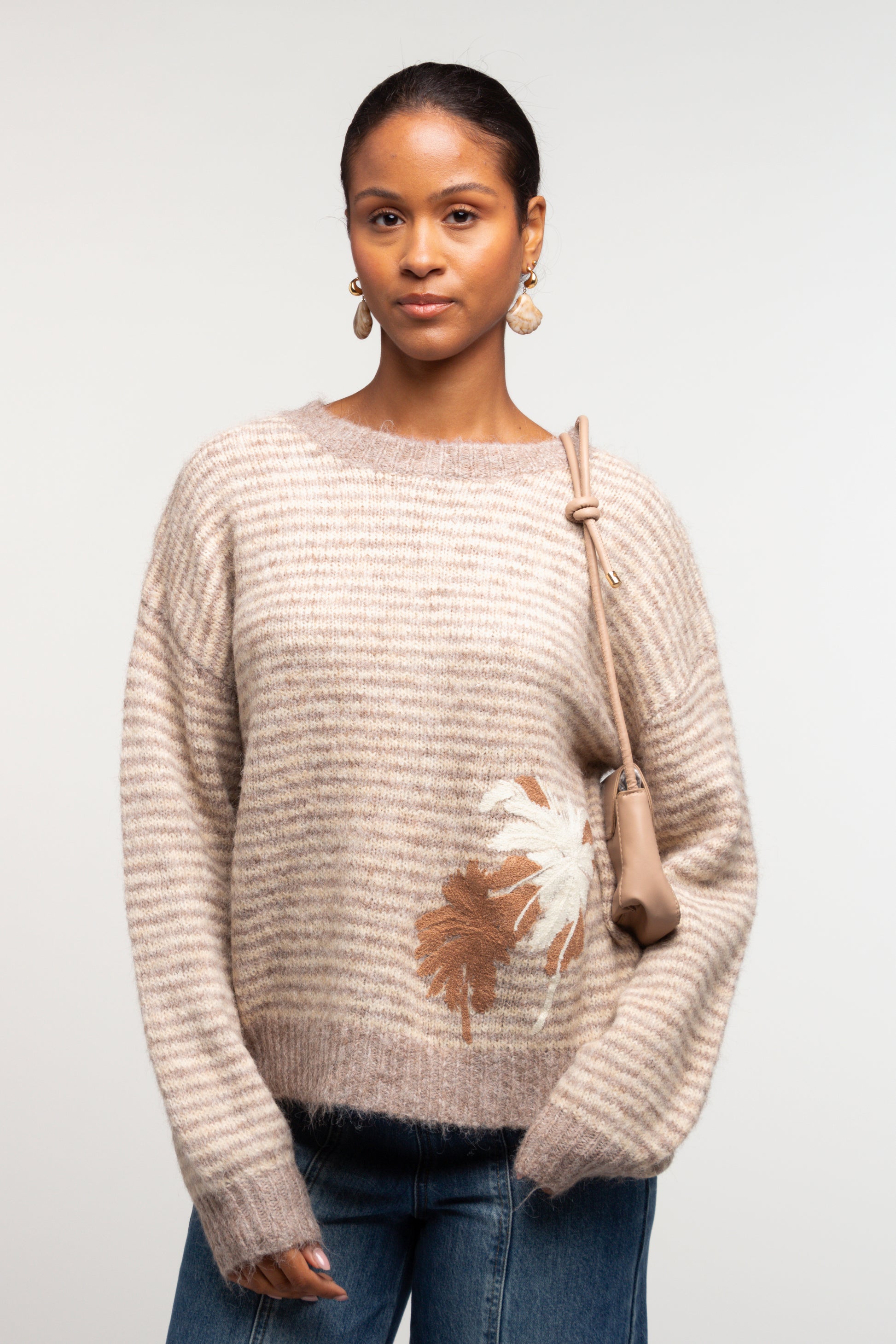 Le pull PALMBEACH apporte une touche solaire et décontractée au vestiaire. Sa coupe confortable, légèrement ample, invite à la détente tout en dessinant une silhouette naturelle et facile à porter. Les rayures graphiques rythment la pièce, tandis que le motif palmier brodé vient signer le modèle avec une note ludique et estivale.