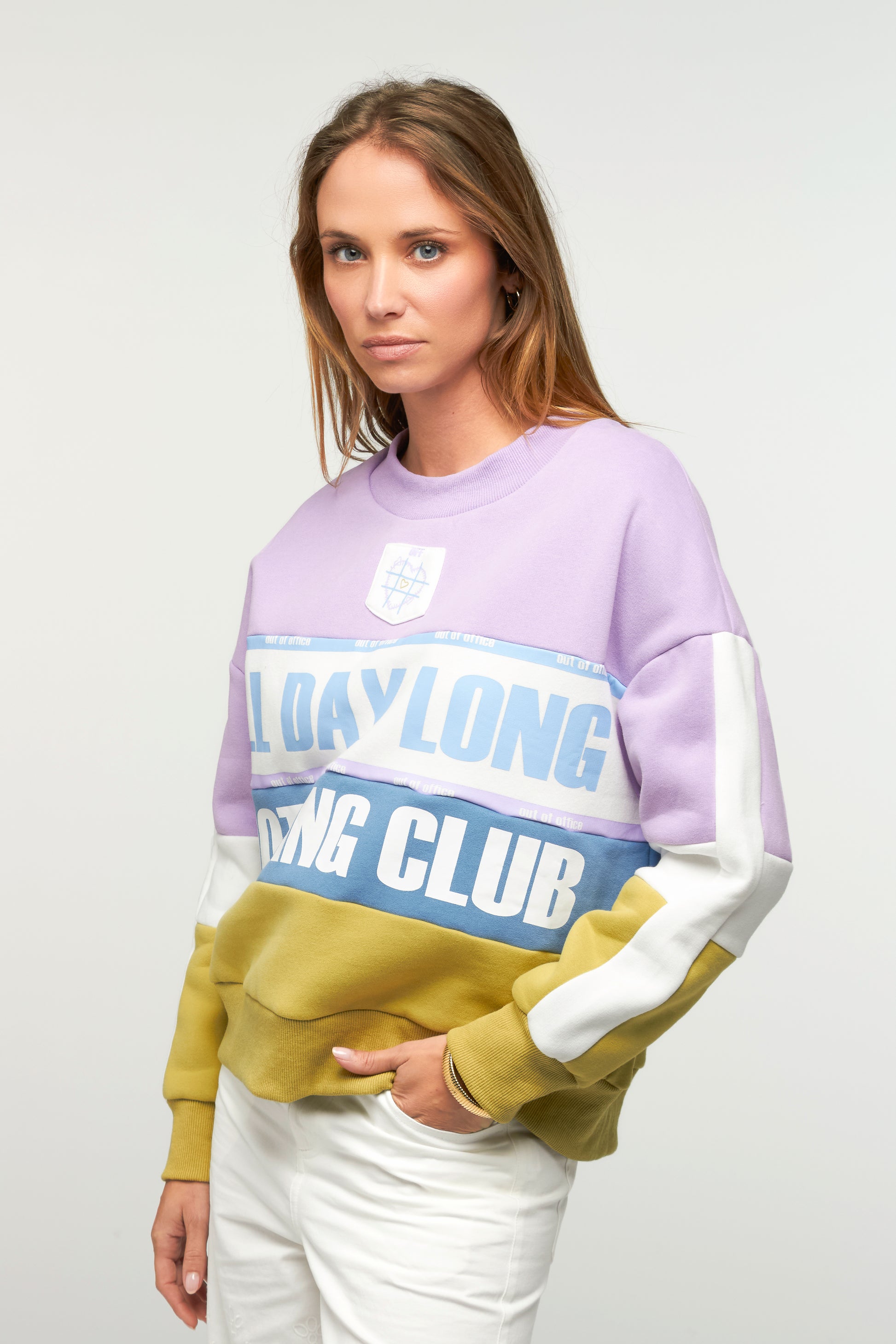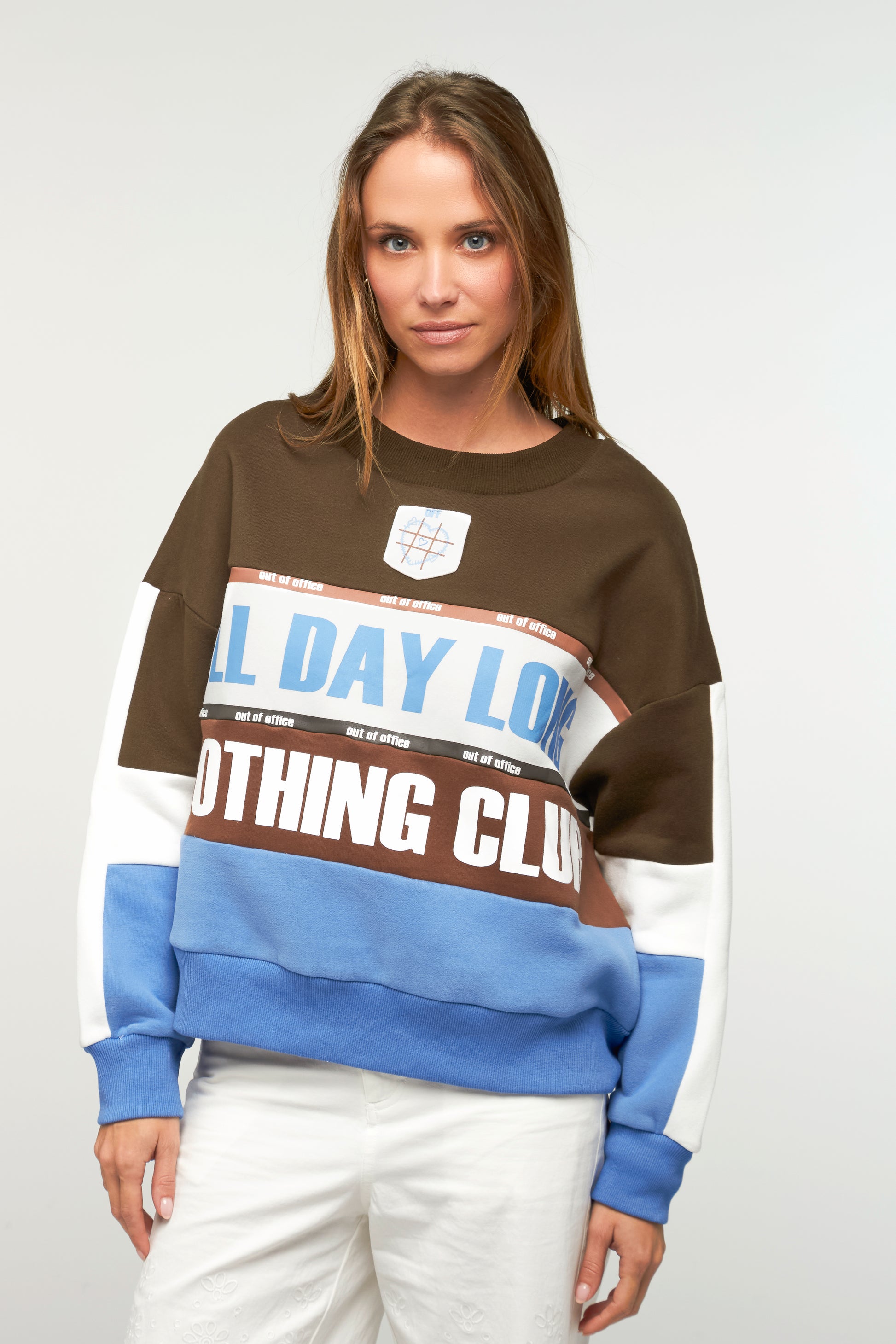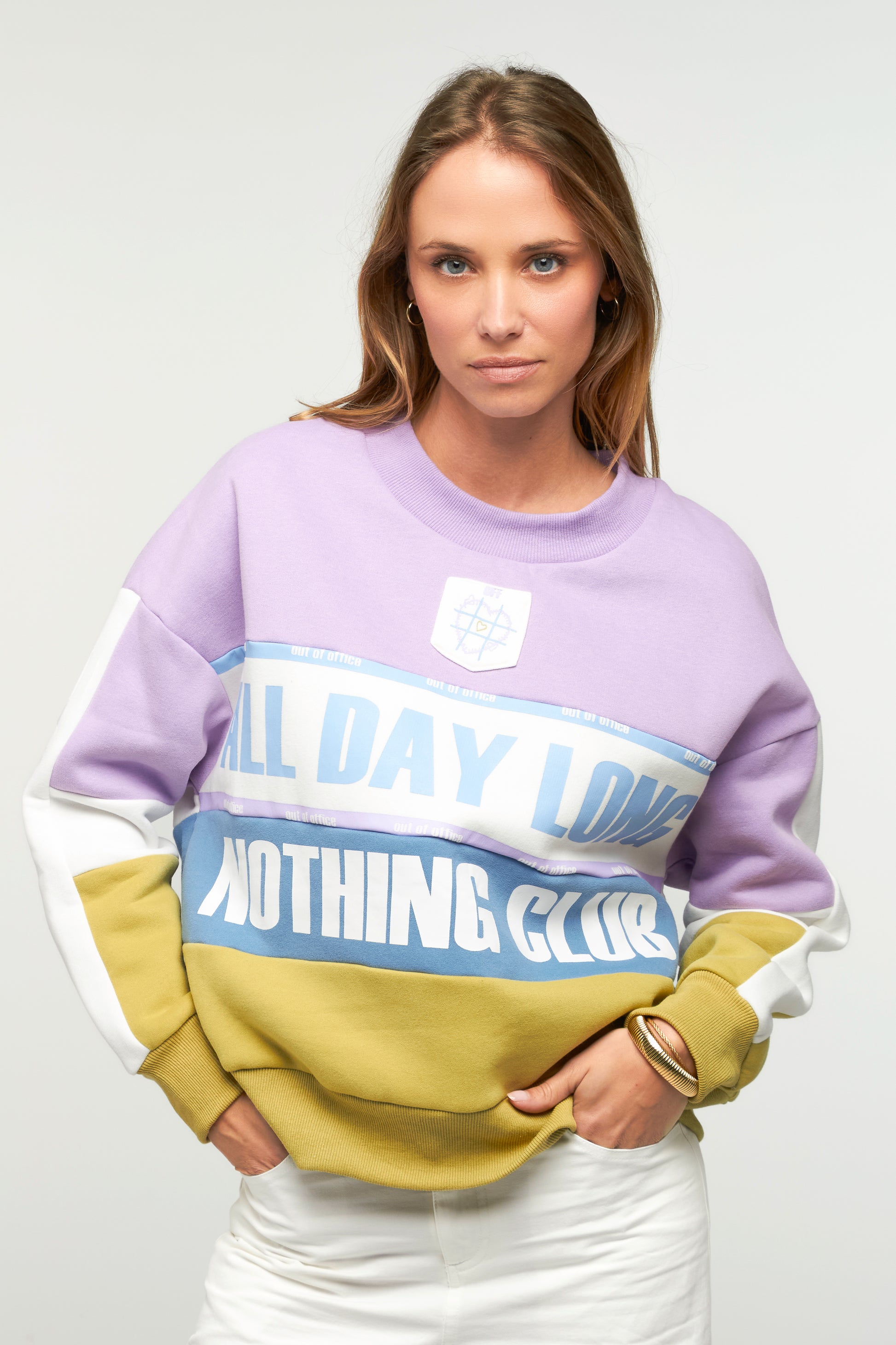 Le sweat FLOW affirme un esprit casual et graphique avec son jeu de bandes contrastées et son message imprimé au centre "All day long", "Nothing club". Sa coupe droite, confortable et facile à vivre, en fait une pièce idéale pour le quotidien. Confectionné dans une matière douce et agréable à porter, il apporte une touche moderne et décontractée à la silhouette.